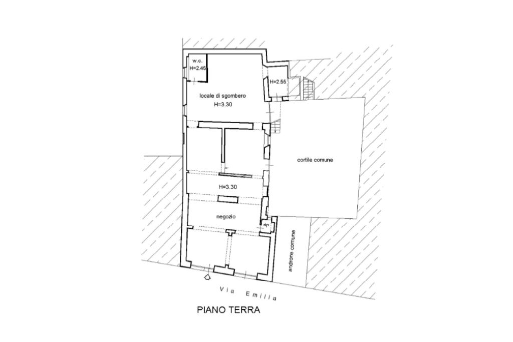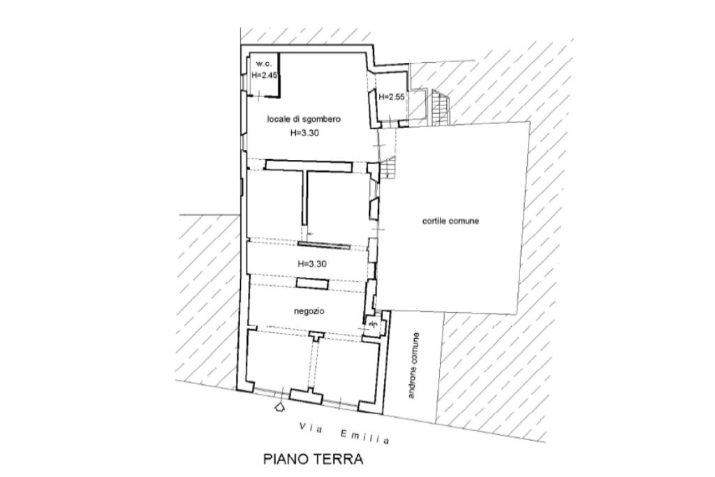 L’immobile si sviluppa su due livelli: il piano terra con una superficie di 145MQ, composto da due vetrine, un servizio igienico, un ripostiglio e un cortile in comune, ideale per carico e scarico di merci. Ed il piano seminterrato con 80MQ.